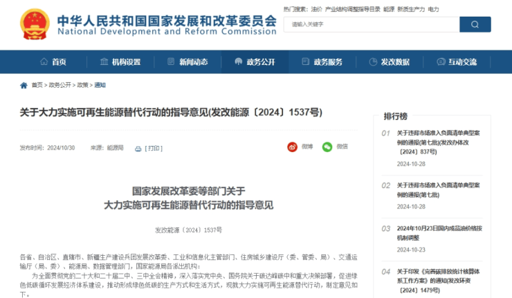 各省、自治区、直辖市、新疆生产建设兵团发展改革委、工业和信息化主管部门、住房城乡建设厅(委、管委、局)、交通运输厅(局、委)、能源局、数据管理部门,国家能源局各派出机构:为全面贯彻党的二十大和二十届二中、三中全会精神,深入落实党中央、国务院关于碳达峰碳中和重大决策部署,促进绿色低碳循环发展经济体系建设,推动形成绿色低碳的生产方式和生活方式,现就大力实施可再生能源替代行动,制定意见如下。