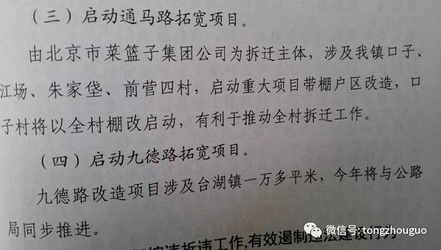 由北京市菜篮子集团公司为拆迁主体,涉及我镇口子、江场、朱家垡、前营四村,启动重大项目带棚户区改造,口子村将以全村棚改启动,有利于推动全村拆迁工作。