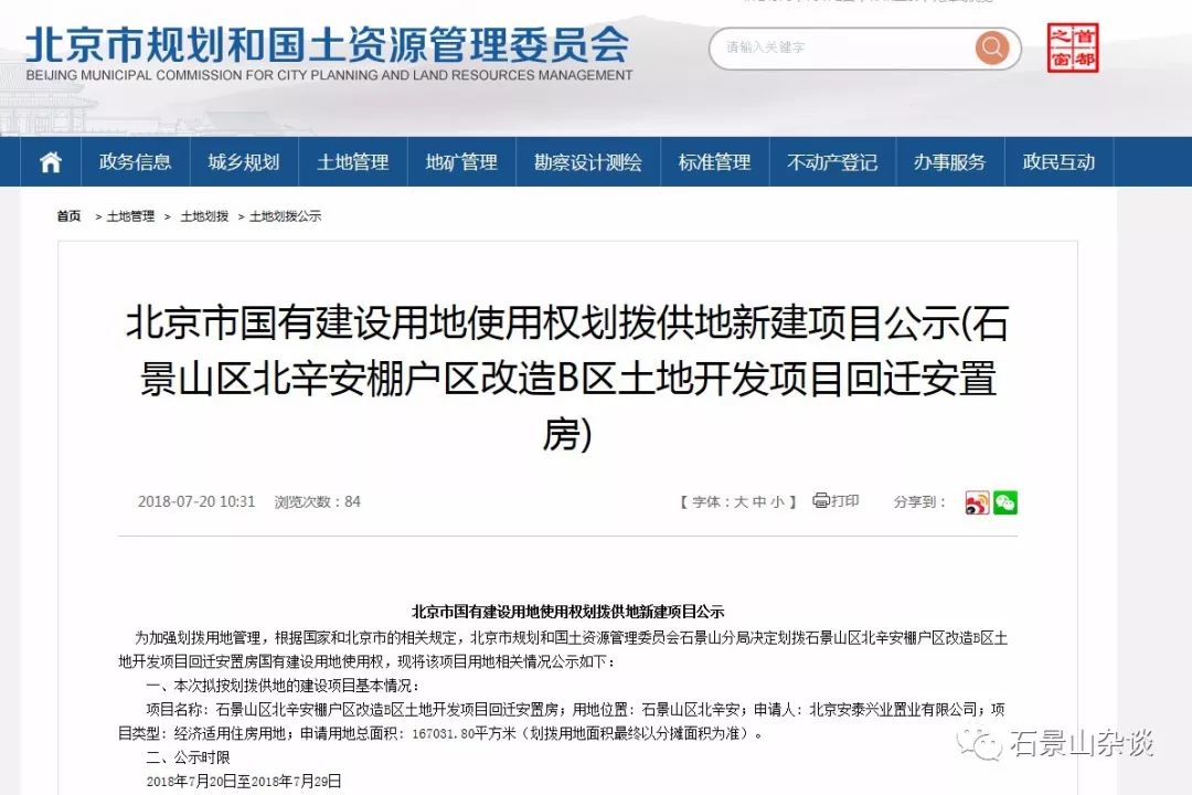 今天,北京规划国土委对北京市国有建设用地使用权划拨供地新建项目(石景山区北辛安棚户区改造B区土地开发项目回迁安置房)进行了公示: