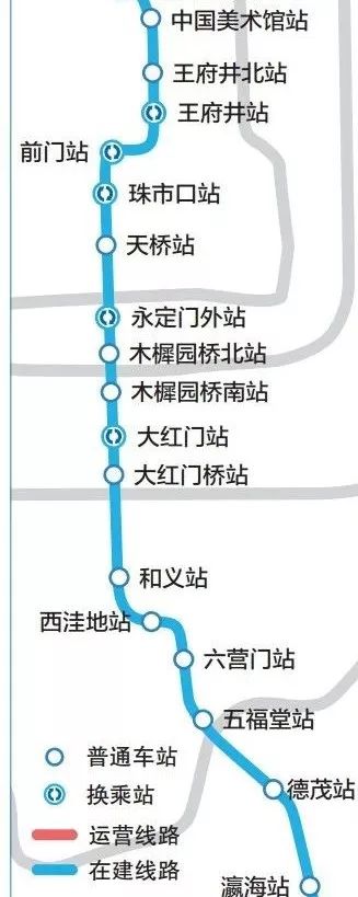 中国美术馆站→王府井北站→王府井站→前门站→珠市口站→天桥站→永定门外站→木樨园桥北站→木樨园桥南站→大红门站→大红门桥站→和义站→西洼地站→六营门站→五福堂站→德茂站→瀛海站