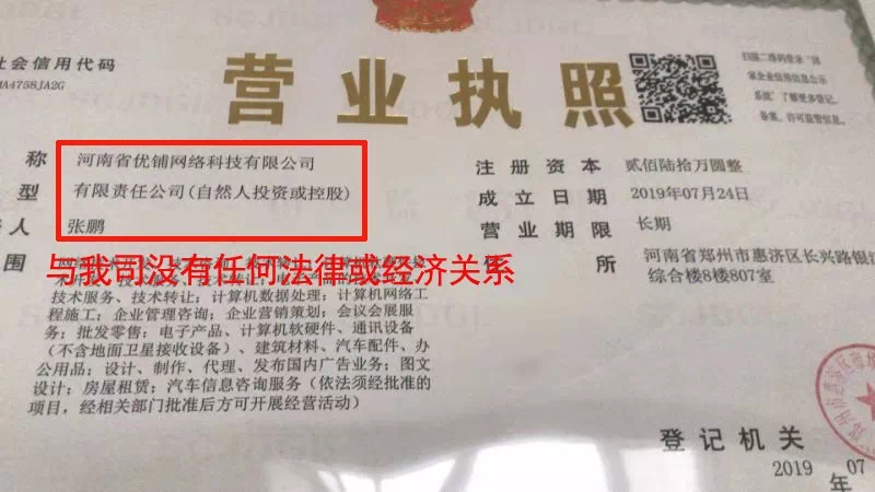 一、河南省优铺网络科技有限公司不是我司关联或合作企业,与我司没有任何法律和业务关系,望周知。