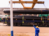 中油宝世顺(秦皇岛)钢管有限公司直缝工厂员工正在切割引吸弧板。中油宝世顺(秦皇岛)钢管有限公司防腐工厂员工正在给钢管贴上钢管信息二维码。中油宝世顺(秦皇岛)钢管有限公司中俄东线天然气管道项目钢管发运现场,发运…