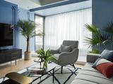 在这套150平米的房子中,整体空间以现代风格的设计,空间内加入大范围的蓝色,使得空间充满安静优雅的气质,并通过异域风情的设计细节与搭配,让空间呈现出一种独特的艺术设计效果。 客厅 ▲客厅整体现代舒适的空间,阳台与客厅打通做成抬高的地台,装上纱帘让自然采光进入客厅,而客厅整体在蓝色的墙面基础,布置深色