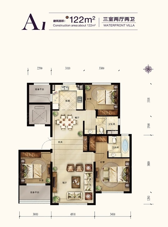 这个户型122平米三室,10.5米的面宽,4.5米进深,这是我们经常提到的大面宽短进深,居住起来舒适度比较高。