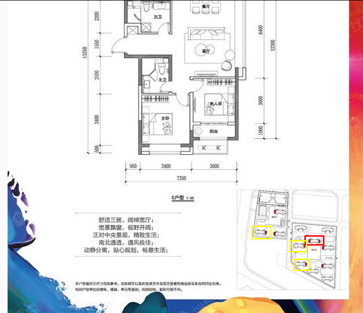 楼栋分析:从右下角的户型楼座分布图上来看,在购买的时候可以优先考虑用红笔勾出来的楼栋,原因有两点:1、楼栋属于小区楼王的位置,位于小区正中央;2、标黄的楼盘,户型客厅在东边,采光好,客厅朝东,正对小区中央采光好,视野好。东面的户型要比西边的户型有优势。