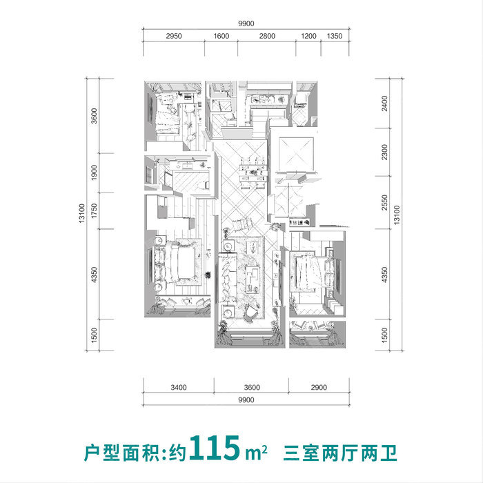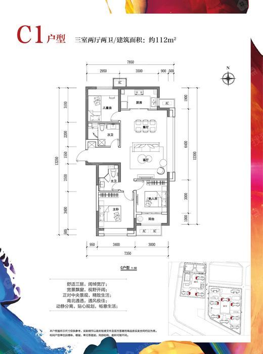 户型分析:这个户型为112平米的三居室,且也是把边户型,三面有采光,这个C1户型为东面把边户型,户型整体设计比较合理,客厅没有按照常规,设计在了户型中央的位置,与四周的活动空间形成一个闭环。