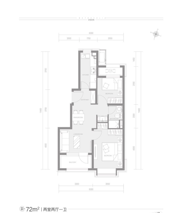 先来看两居户型,建筑面积为72平,通透格局,卫生间处在两个卧室中间,日常使用较为方便。每个空间比较方正,浪费面积少。