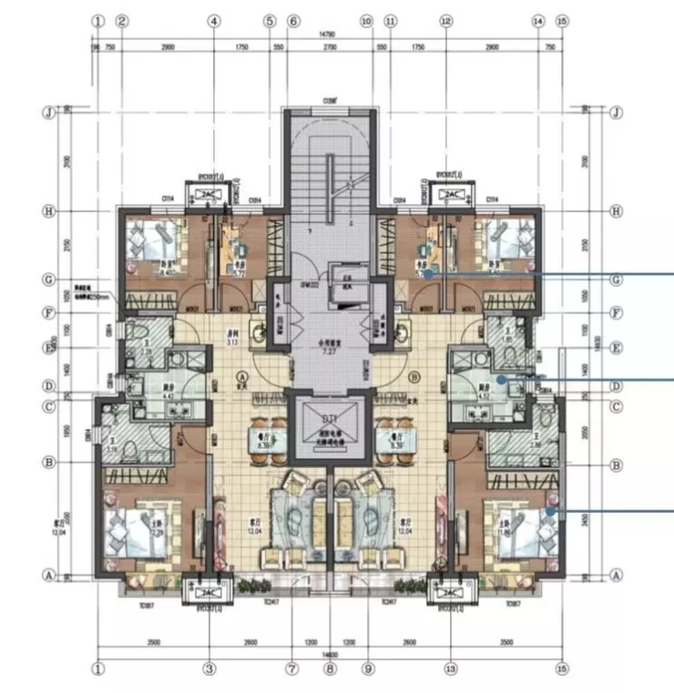 项目170㎡五室两厅三卫户型图如上所示,该户型南北通透,整体是长面宽短进深的结构。南向两个套间、一个客厅和一个次卧,四面宽达到了14.8米。可惜的是,南向次卧套间的卫生间为暗卫。