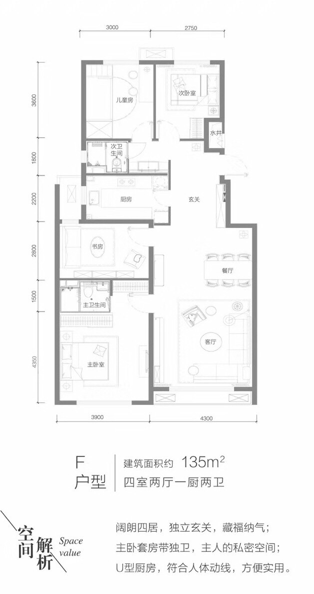135平的四室两卫,这个户型可以看成89平户型中部位置插入了书房空间,并延长了客厅长度,客厅4.3米的面宽,主卧套间设计。客卫也做成干湿分离设计,增加其使用能力。