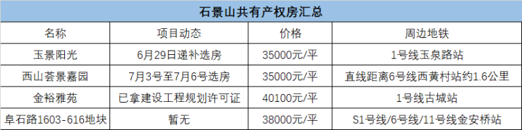 最近石景山楼市真的很热闹,纯商品房中海寰宇天下抓住6月的尾巴,将在6月30日开盘,加推最后3栋楼,限竞房新城首创禧悦学府城市展厅已经对外开放,共有产权房就更热闹了。西山荟景嘉园7月3号至6号选房,玉景阳光6月29日进行递补选房活动。焦点君给大家整理了石景山共有产权房较新动态,包含待网申项目,其中不乏地段还不错的,比如说阜石路1603-616地块,距离地铁金安桥站仅400米,想必会吸引一波购房者的关注,今年年初刚拿的地,目前还没太多动静。今天给大家重点说说玉景阳光,微信搜索“goufang02“,添加购房置业小秘书入群,房产咨询,有问必答!