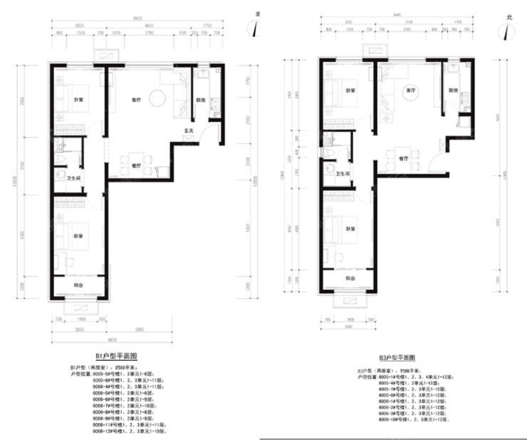 B1、B3户型为客厅朝北的南北两居,是卧室和客厅处在阴面,没有办法享受阳光的美好。边户单元卫生间为明卫。