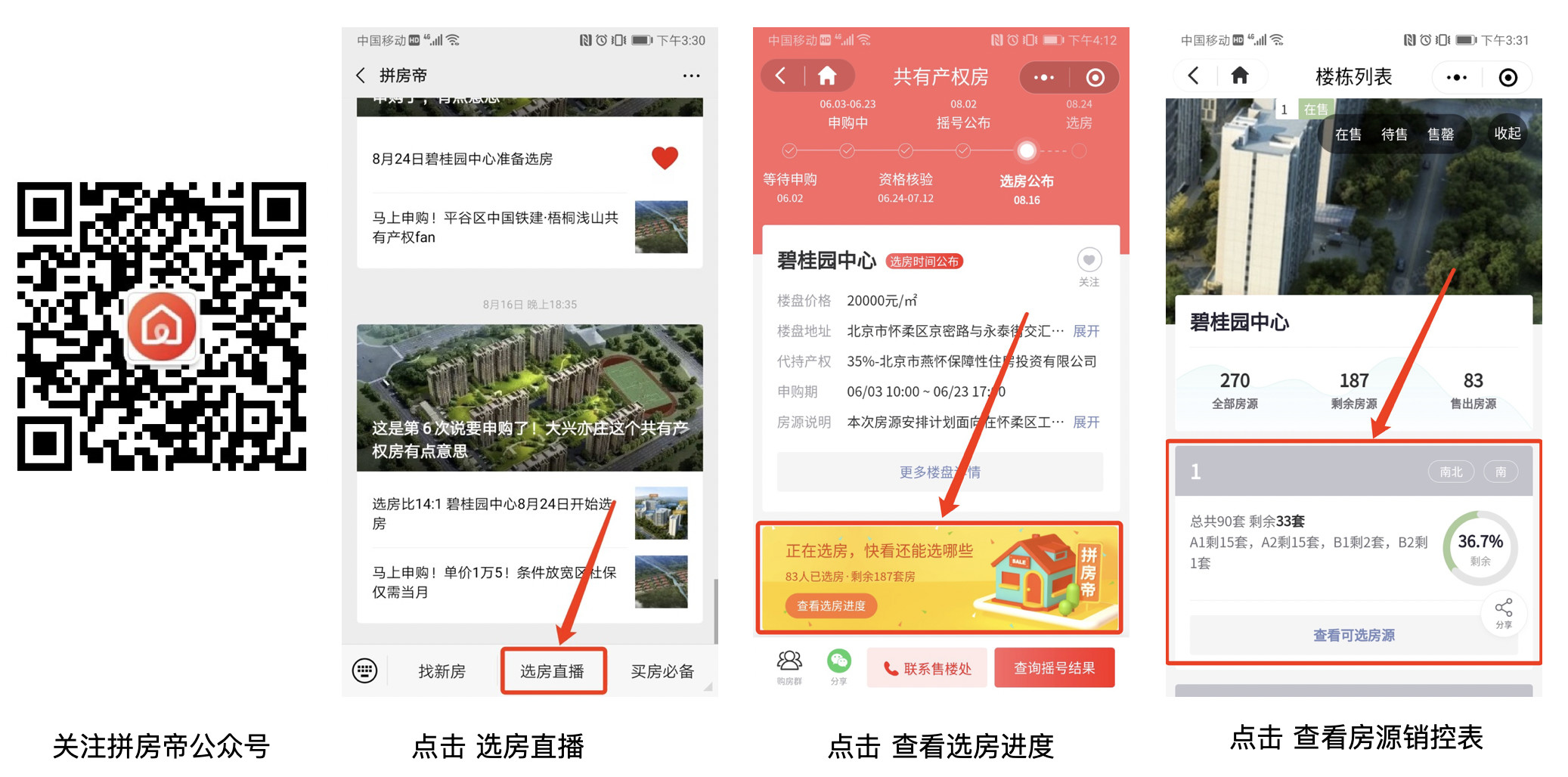您关注“拼房帝”公众号,点开底部“选房直播”,就能进入到要选房的项目页,点击中间黄灿灿的“正在选房”,就能看到项目选房进度。如下图操作↓
