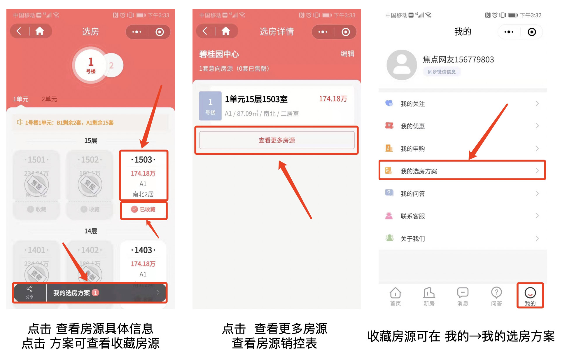 进入楼盘销控表,感兴趣的房源可以直接“收藏”,也可以进入房源详情页点击“收藏”。收藏后的房源会出现在“我的选房方案”,点击可集中查看。小程序首页底部“我的”也能看到选房方案,点击“查看更多房源”再次进入销控表页哦~