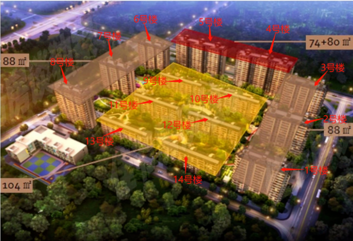 1-3号楼和6-8号楼这六栋均为88平三居,总高14-15层;