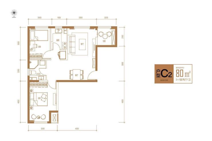 C2户型为80平米2+1室两厅一卫户型,主卧朝南,户型设计较为灵活,采光偏差。