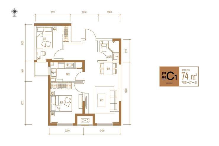 C1户型建筑面积为74平米,两室一厅一卫设计,纯南向,次卧相对而言采光较差一些,不过温暖舒适,明厨暗卫,动静分离。