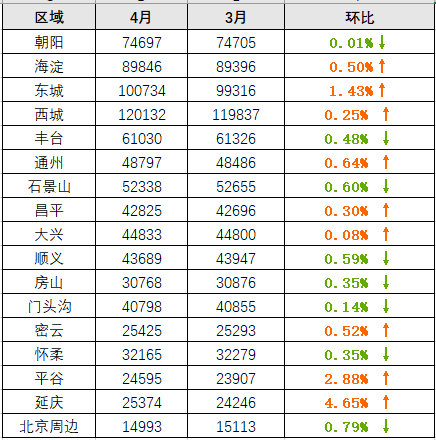 从图表可以看出,北京二手房市场的同比成交量稍有增加,那么各个区域房价涨幅如何呢?