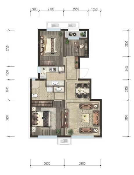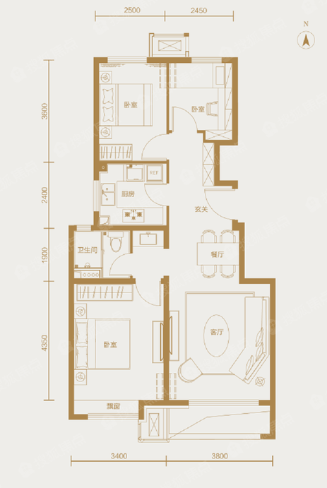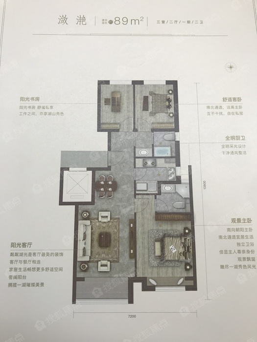 适用“7090政策”, 首开熙悦观湖主推3居2厅2卫的89平米户型,也是经典的“三段式”,客厅和主卧在一侧,两个小卧室在另一侧,中间为厨卫和餐厅。客厅和主卧的总面宽仅7.2米,个人感觉尚不够敞亮,活动空间有点局促。后期若是出了样板间,大家可以根据实际得房率再计算一下实际可使用空间。