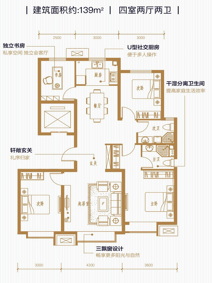 户型方正、主卧套房、三飘窗设计
