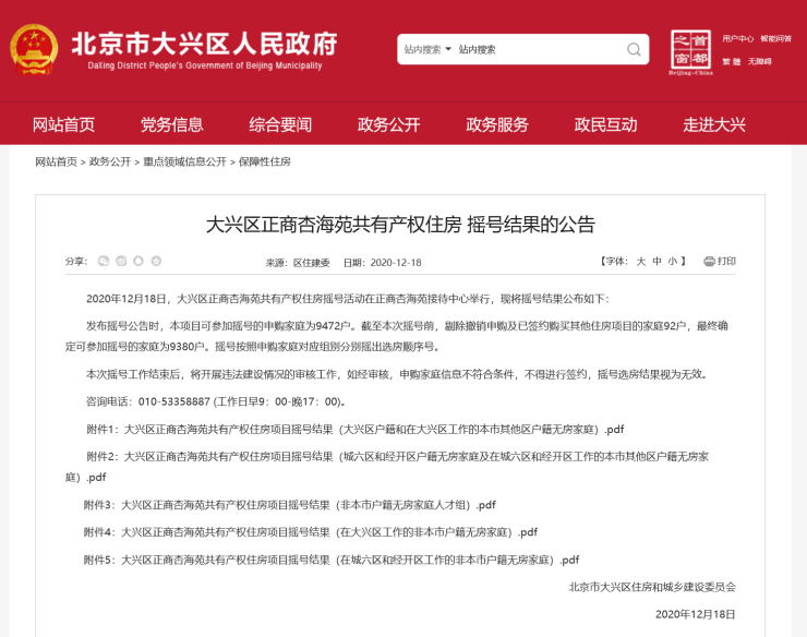 2020年12月18日下午14:00,大兴区正商杏海苑共有产权住房进行公开摇号,随后摇号结果出炉。最终确定可参加摇号的家庭为9380户,摇号按照申购家庭对应组别分别摇出选房顺序号。本次摇号工作结束后,将进行一段时间的资格核验。届时,买房人可通过大兴政府网查询摇号结果。具体公告详情如下,值得注意的是,本次将京籍和非京籍可选房源提前公布,大家可以做好选房准备。