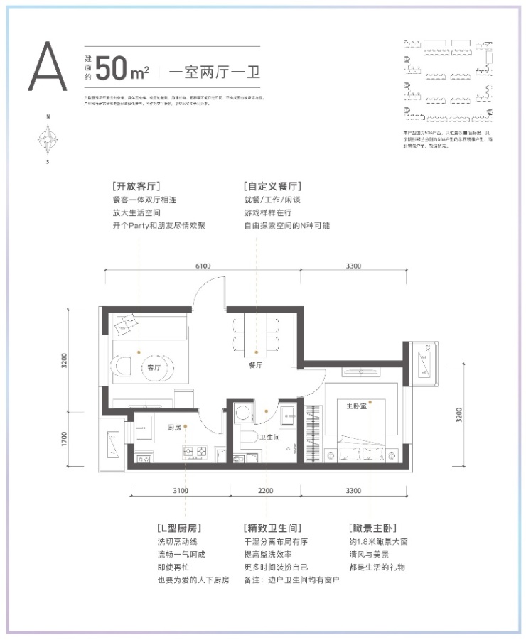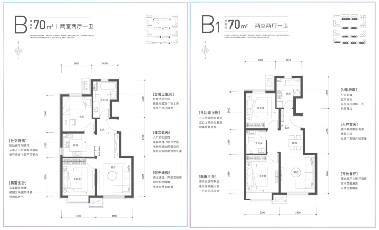 70平两居房源是主力,也是较新的户型设计。该户型位于社区较中间的位置,一般也是社区中较好的位置,享受超大楼间距,视野还无遮挡。B户型较吸引人的是卫生间里的浴缸,累了还能泡个澡,这在小户型设计里独树一帜,年轻人也能追求小资体验。B1户型就中规中矩一些,客厅及主卧均朝南,主卧带飘窗,扩大使用空间;多功能次卧可做二人世界的衣帽间、三口之间的儿童房,灵动性强;U型厨房可尽情施展厨艺,为生活添气息。
