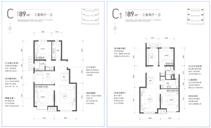 89平米三居也有两种户型,重点说说C户型,该户型虽然也是客厅和主卧均朝南、主卧带飘窗,但不同之处是该户型内部空间比C1户型更为方正写,厨房卫生间的采光都能保证。户型整体结构与主流小三居“三段式”户型类似,是大家常见的户型,就不多说了。