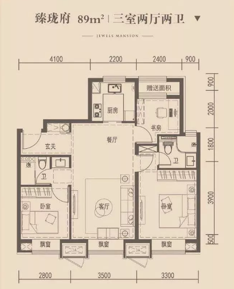 禧瑞天著的户型设计较为一般,图上三居89平,主卧和客厅朝南,次卧均朝北向,一个卫生间,厨房属于U型设计,总价在460万左右。