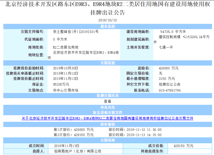亦庄臻珑府位处于亦庄路东区,项目于2019年11月13日经两轮报价,被招商竞得。溢价率0.5%,楼面价27936元/平方米。政府限定均价52695元/平,执行70/90政策,也是北京出土住宅新规后,不在"搭"商办的排名前列纯粹住宅用地。