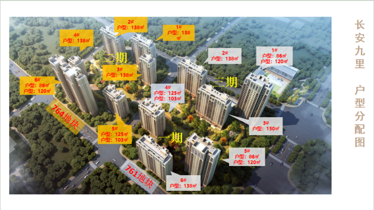 最近,古城版块的长安九里又有新消息了,项目已于11月下旬加推三期房源,加推楼栋为761地块1、2、3号楼,产品有86平两居,120平三居,138平四居,150平四居,以改善产品为主,户型分布如下: