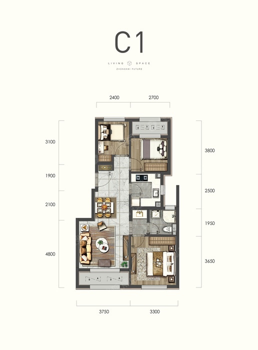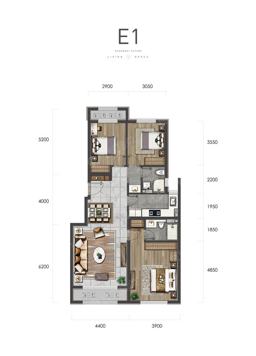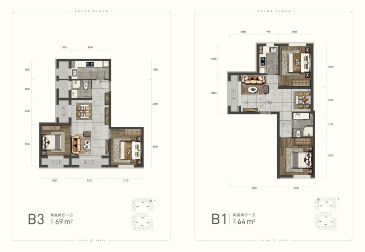 两居分布在1号楼、3号楼以及5号楼的边角处,仅有二十多套。从户型来看,B1和B3户型优先选,分布在1号楼的1单元和3号楼的1单元。