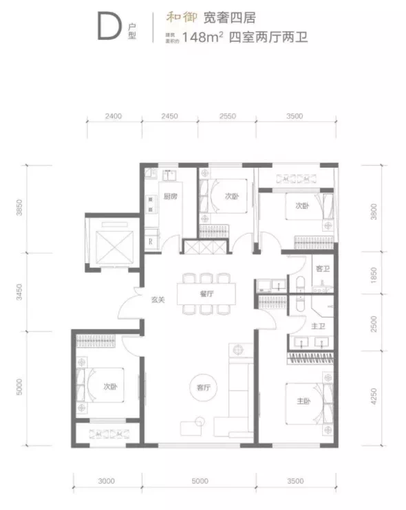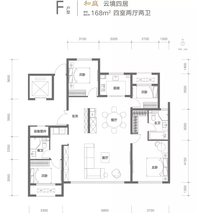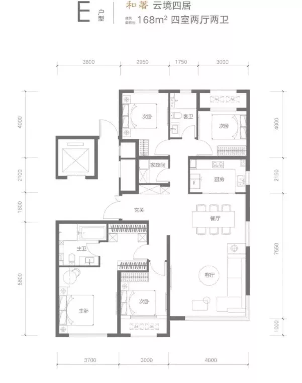较大的 168 平四居如下图,是传统的 " 四叶草 " 户型,客厅面宽 6.8 米,进门玄关有效的起到了视线遮挡、空间分割又不影响整体通透性的,卧室分布在房间四角,私密性更加。
