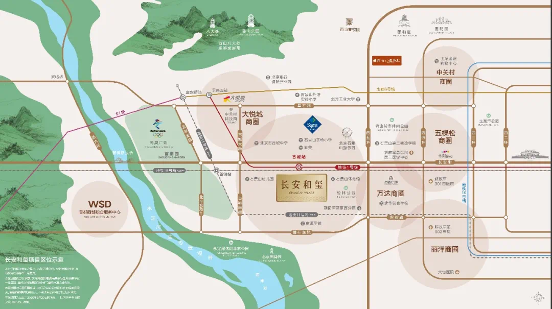长安和玺距离地铁 1 号线古城站直线距离不过 200 米,不到 2 公里就是五环,位置无可挑剔。