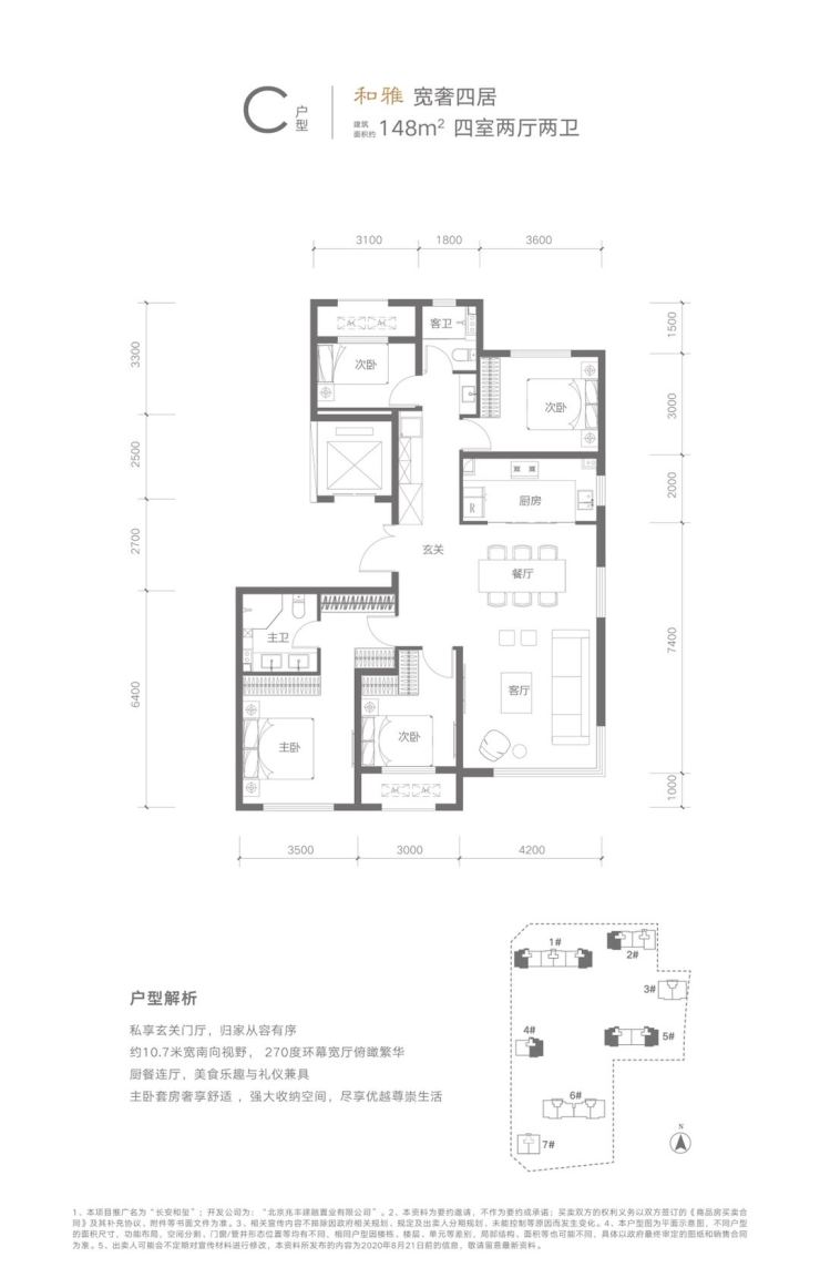 C户型:148平四居,分为边户、中间户两种户型,本文展示的是边户,除主卫外,均有窗户,这个户型的亮点是客厅,270°“转角厅”设计,室内显得更宽敞,主卧套间设计,有独立的卫生间和衣帽间;厨房为U型设计,储物功能更强。