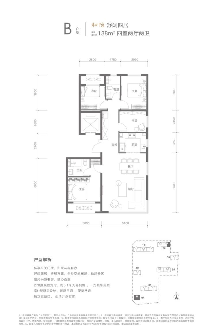 B户型:138平四居设计,分布在2#,7#,南北通透,客厅亮点十足,270度观景客厅设计,屋里更加亮堂。主卧带卫生间,北向的客卫在两个卧室中间,生活起来比较方便,此外,还带有书房,便于办公和学习。