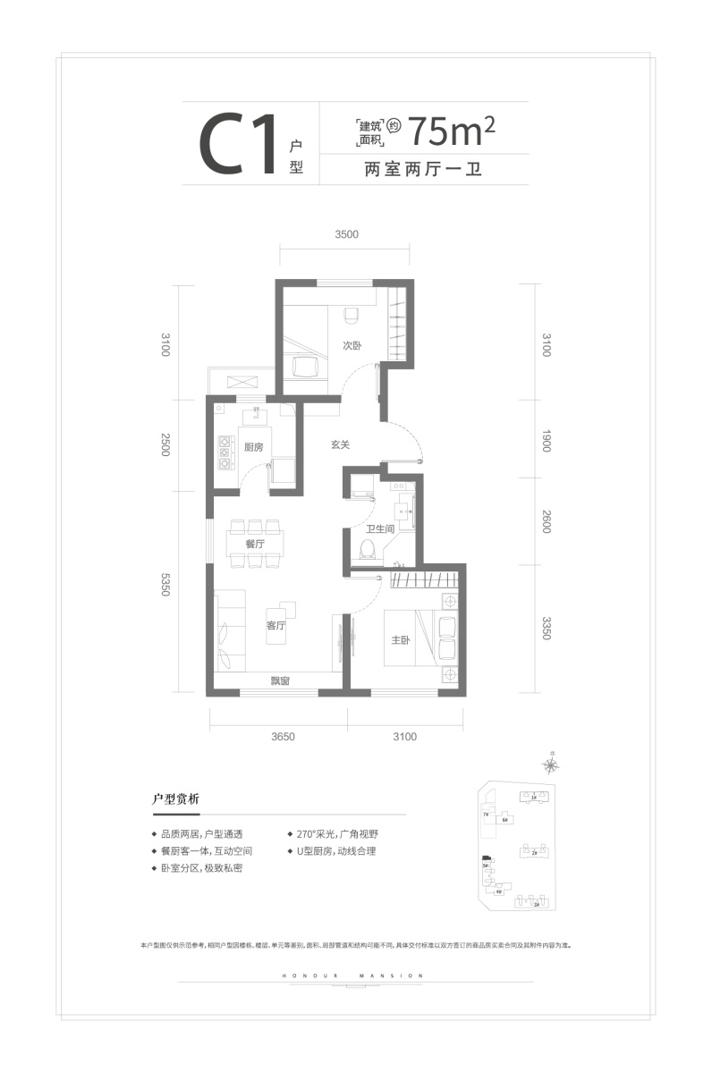 品质两居、U型厨房、餐客一体、270°采光