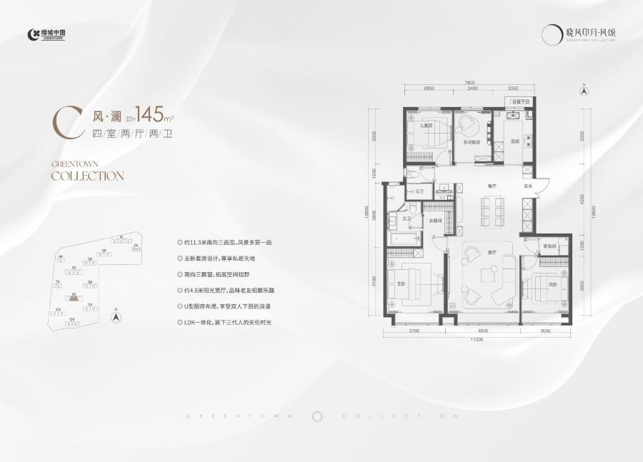145的四居扩大了主卧和客厅的尺度,整体南向面宽达到11.3米,主卧的衣帽间和浴缸都,独立的家政间。 样板间