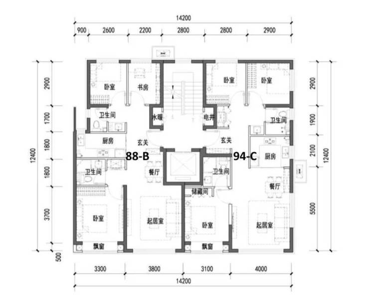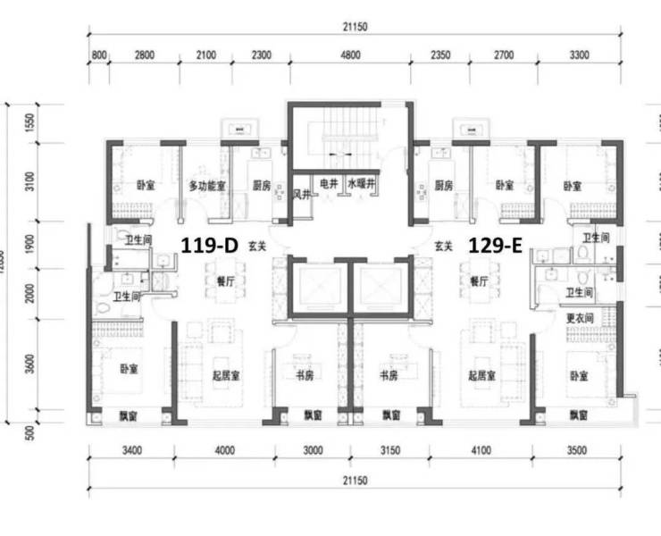 119/129㎡紧凑四居,加一起约360套房源,户型全明,四叶草户型,全明格局,两个卧室挨着,为后期打通改造留出了空间。