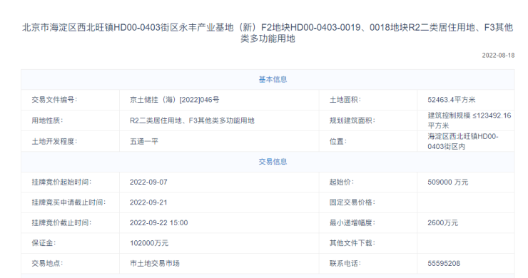 海淀区西北旺镇永丰产业基地(新)F2地块在北京第三次集中供地中,被海开+中建三局以53.18亿元竞得,根据控规显示,土地面积5.24万平,总建控规模12.3492万平,R2二类居住用地建控规模约9.6872万平,全部建设商品住房,无套内70/90限制,无需配建保障房。