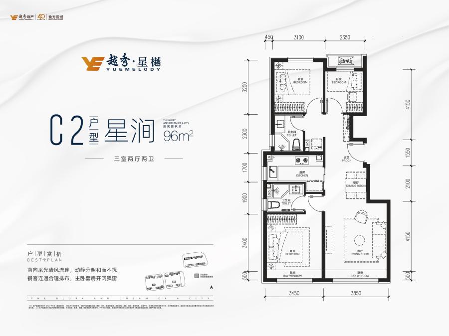 C2:建面约96平米三居(端户)-3室2厅2卫-96.0㎡