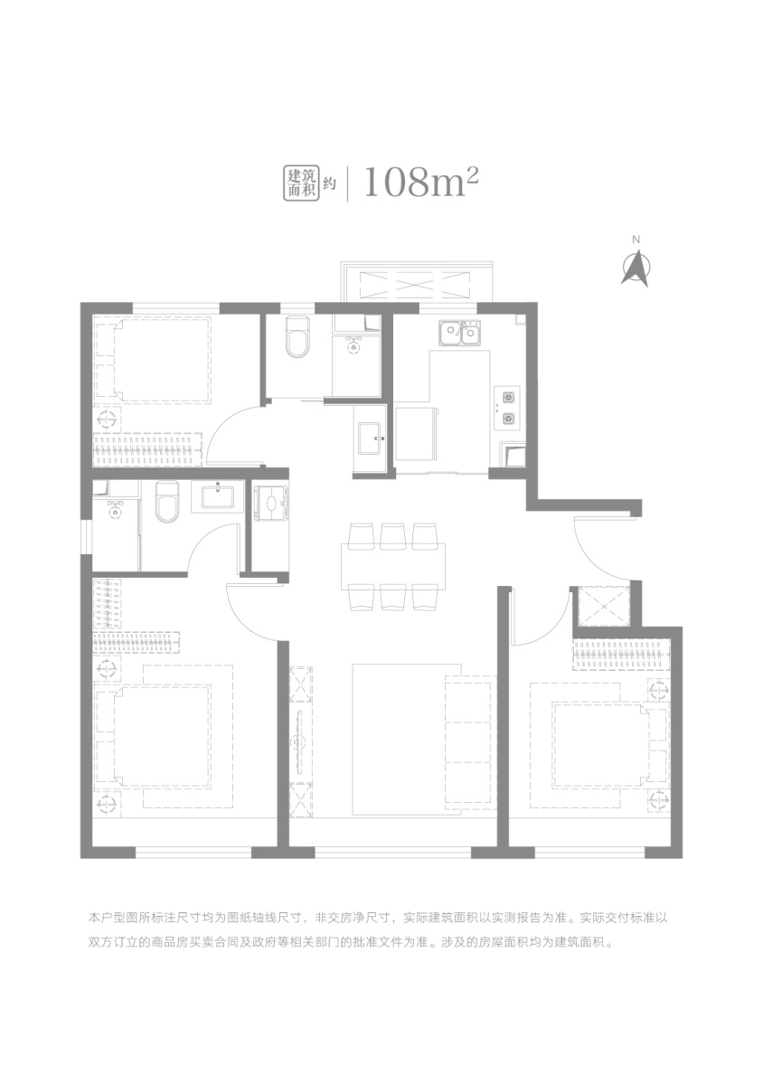 【107㎡ 3室2厅1厨2卫】南北采光,全明方正,设置独立家政间且具备上下水条件;区域内同面积段产品普遍无家政间或不具备安装洗衣机条件