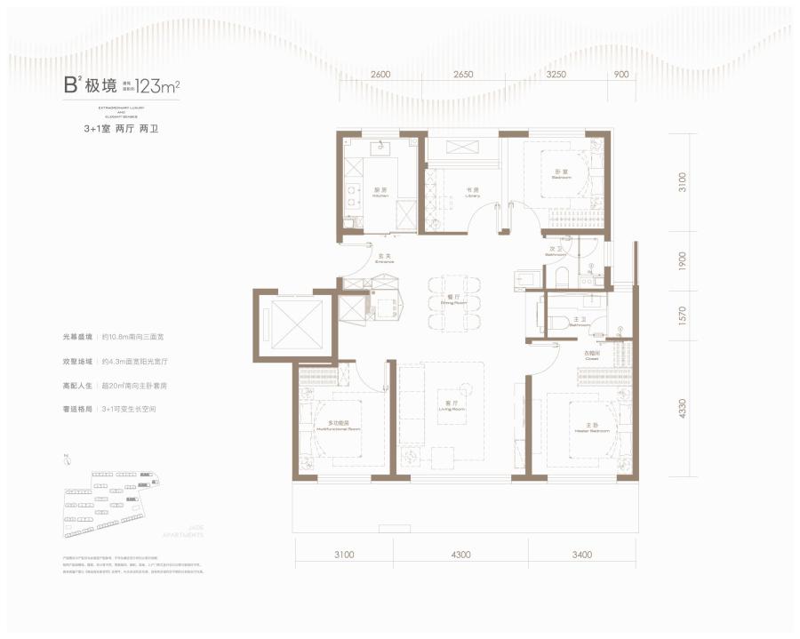 作为顺义主城区改善标杆,建面约123㎡户型,创新3+1可变生长空间,三大卧室满足家庭核心成员的居住所需,多一室空间,可作为爱好空间的延展。北侧卧室及书房,亦可打通为套房,形成全屋双套房模式。