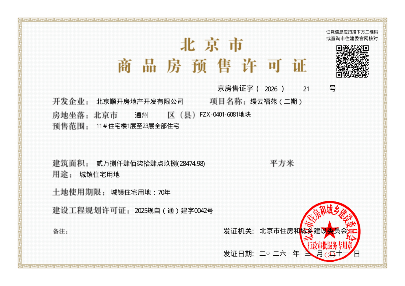 京房售证字(2026)21号 查看图片 | 2026-03-21 | 11#住宅楼1层至23层全部住宅 |