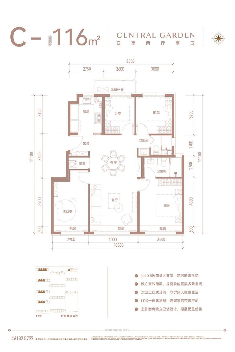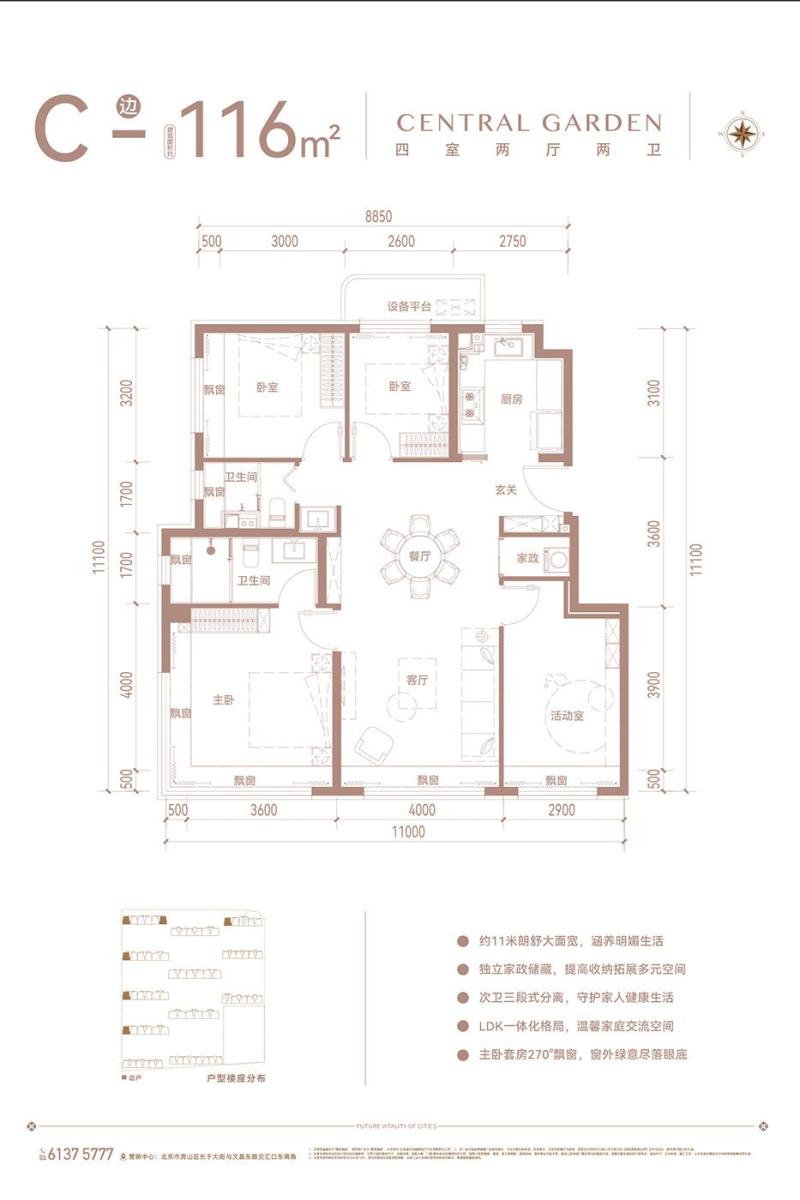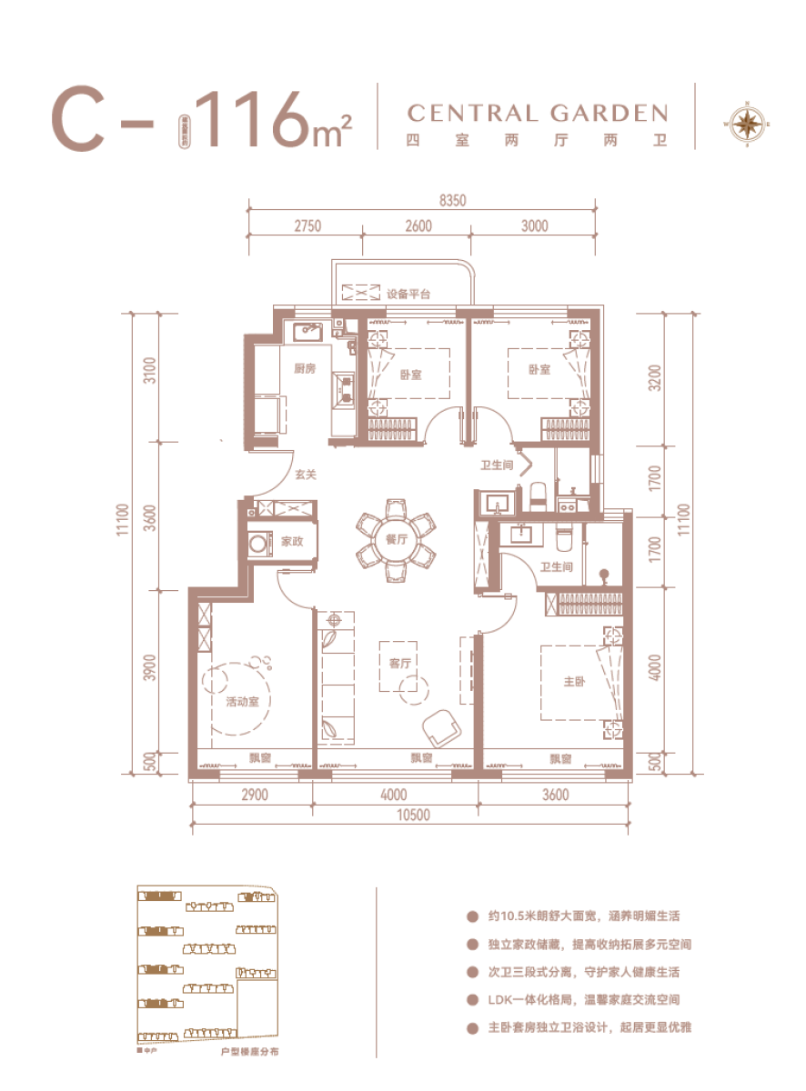 四室两厅两卫,约11米朗舒大面宽,涵养明媚生活,独立家政储藏,提高收纳拓展多元空间,次卫三段式分离,守护家人健康生活,LDK一体化格局,温馨家庭交流空间,主卧套房270°飘窗,窗外绿意尽落眼底。
