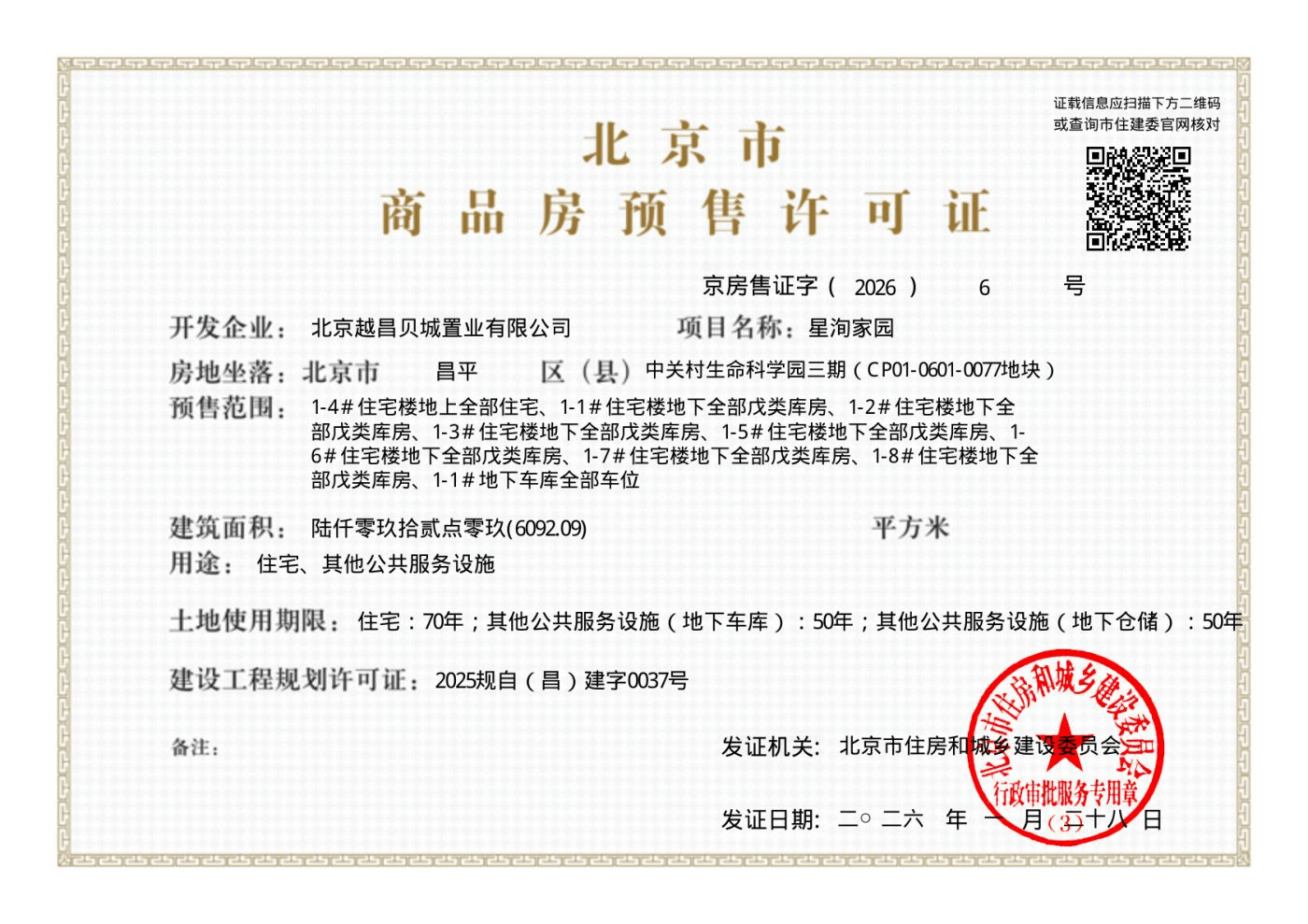 京房售证字(2026)8号 | 2026-02-05 | 2-2#住宅楼1层至18层全部住宅、2-3#住宅楼1层至18层全部住宅、2-4#住宅楼1层至11层全部住宅、2-5#住宅楼1层至11层全部住宅、2-6#住宅楼1层至11层全部住宅、2-7#住宅楼1层至8层全部住宅 |