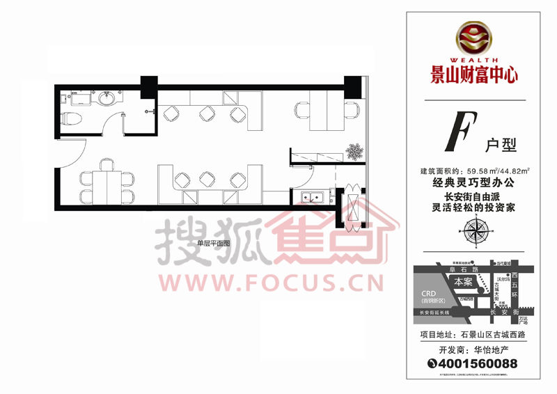 景山财富中心距离一号线古城地铁站1500米,位于长安街北侧700米,古城大街与古城西路交叉口往西约600米,长安街与古城西街交叉口往北700米。项目地上8层,地下3层;地下三层到地上四层层高5.4米、地上五层到七层层高3.1米;户型为45-139平米弹性组合空间。