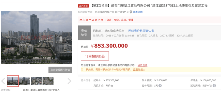 2月25日,据京东资产交易平台显示,在经过58轮竞价后,成都门里望江置地有限公司 “顺江路333”项目土地使用权及在建工程以8.533亿元的价格成交,溢价率为16%。