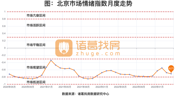 根据诸葛找房数据研究中心监测数据显示,2023年04月,北京市场情绪指数为-0.71,较上月下降0.03,位于市场观望区间。