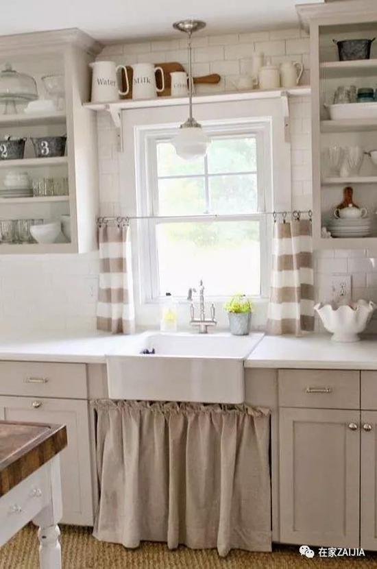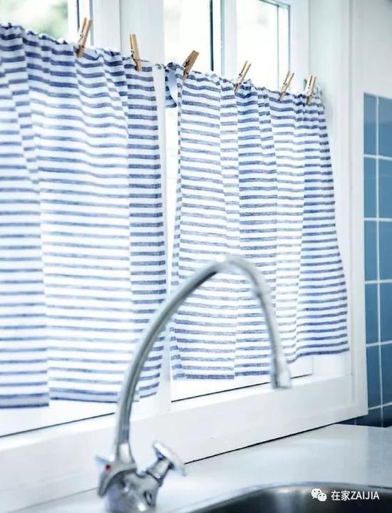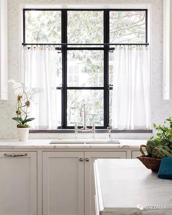 窗台短帘一般用在洗手盆前的半窗。一般选用透光又有一定装饰性的棉麻质地,还能一定程度防止水渍、油渍飞溅在玻璃上。日式小清新和法式田园风厨房都爱它!