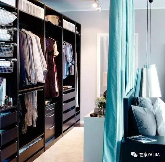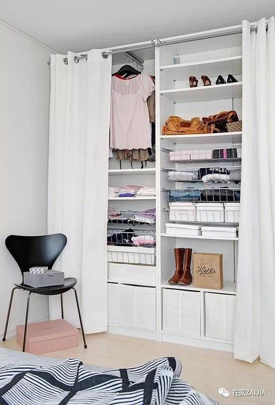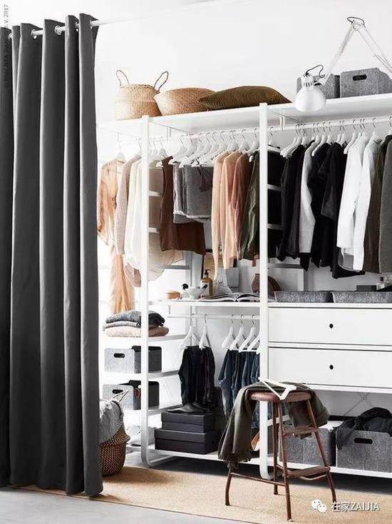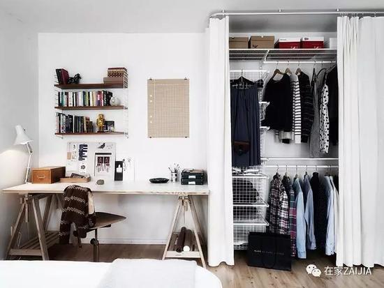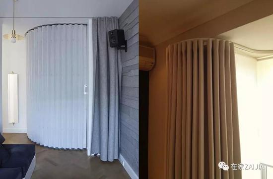 同法炮制,你可以在家里的各个空间灵活安置衣柜,可以弯折的滑轨可以保证窗帘三面遮盖衣服,防止积灰,清洁度更高。