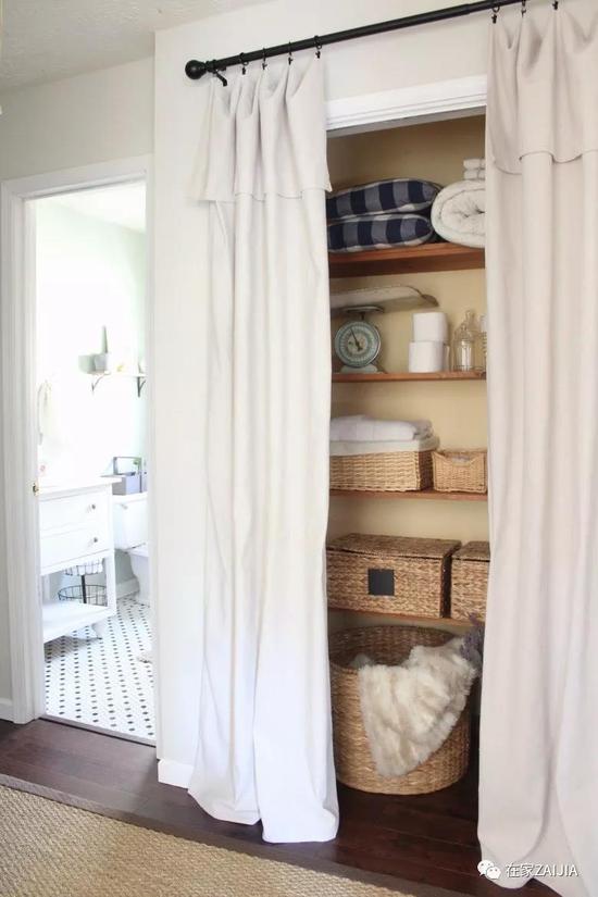 老房子留下的壁龛,拆掉丑丑的柜门,挂个简单的小帘充分利用收纳空间!
